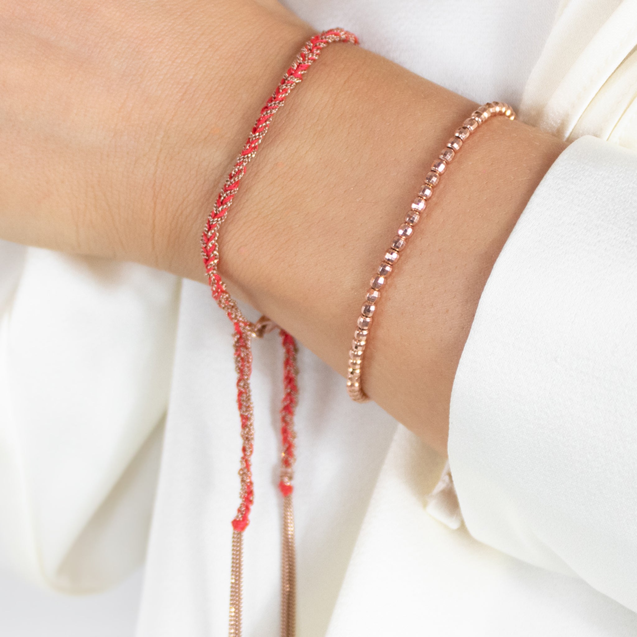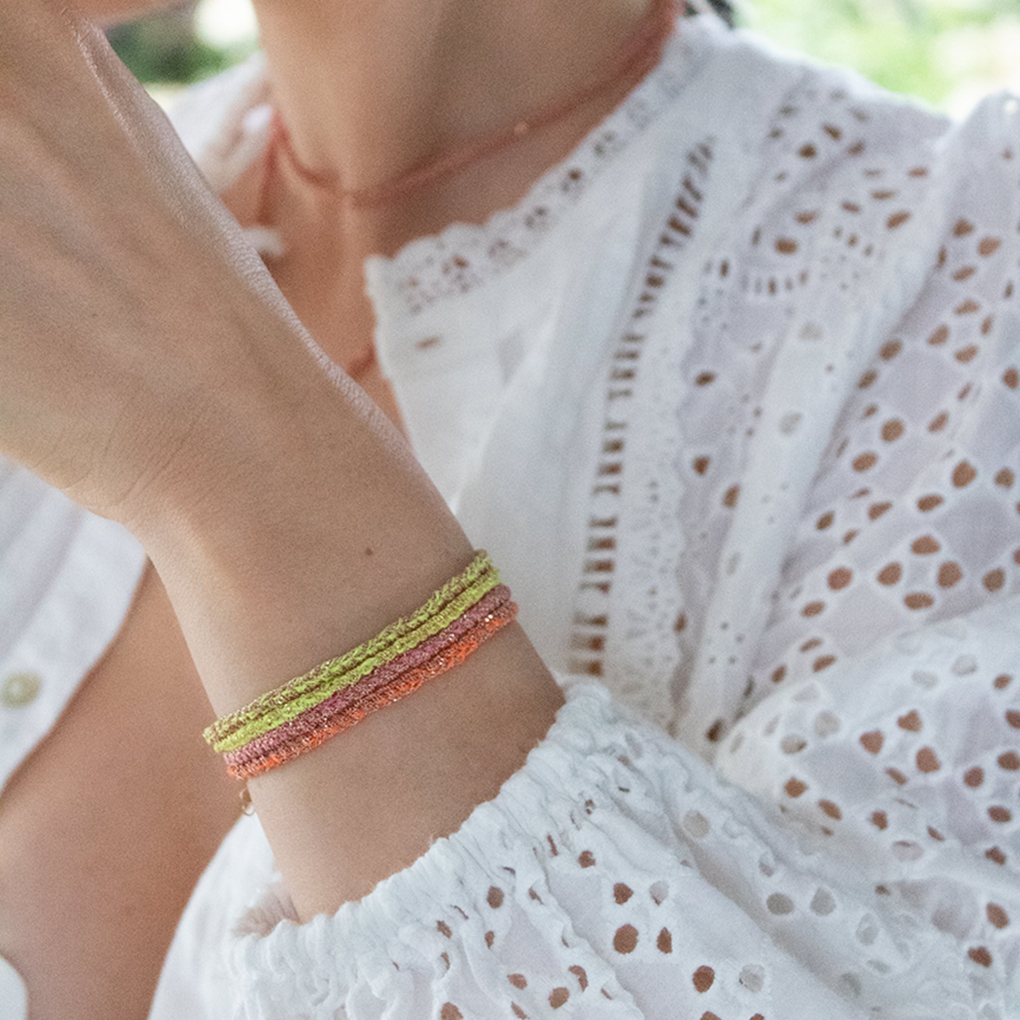 New for 2023, these fun and colourful charm bracelets are made with 18ct Gold Vermeil chain weaved with Silk, featuring a pretty gold charm at the end. Adjustable in length, it makes the perfect gift and can easily be stacked with any bracelet.