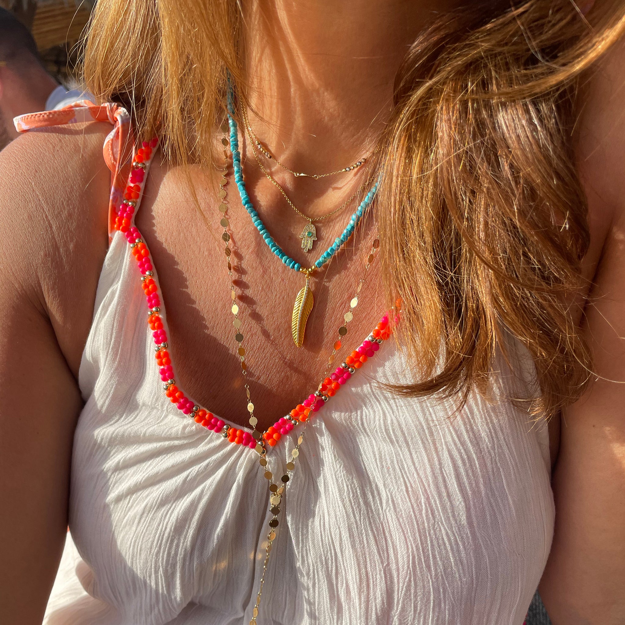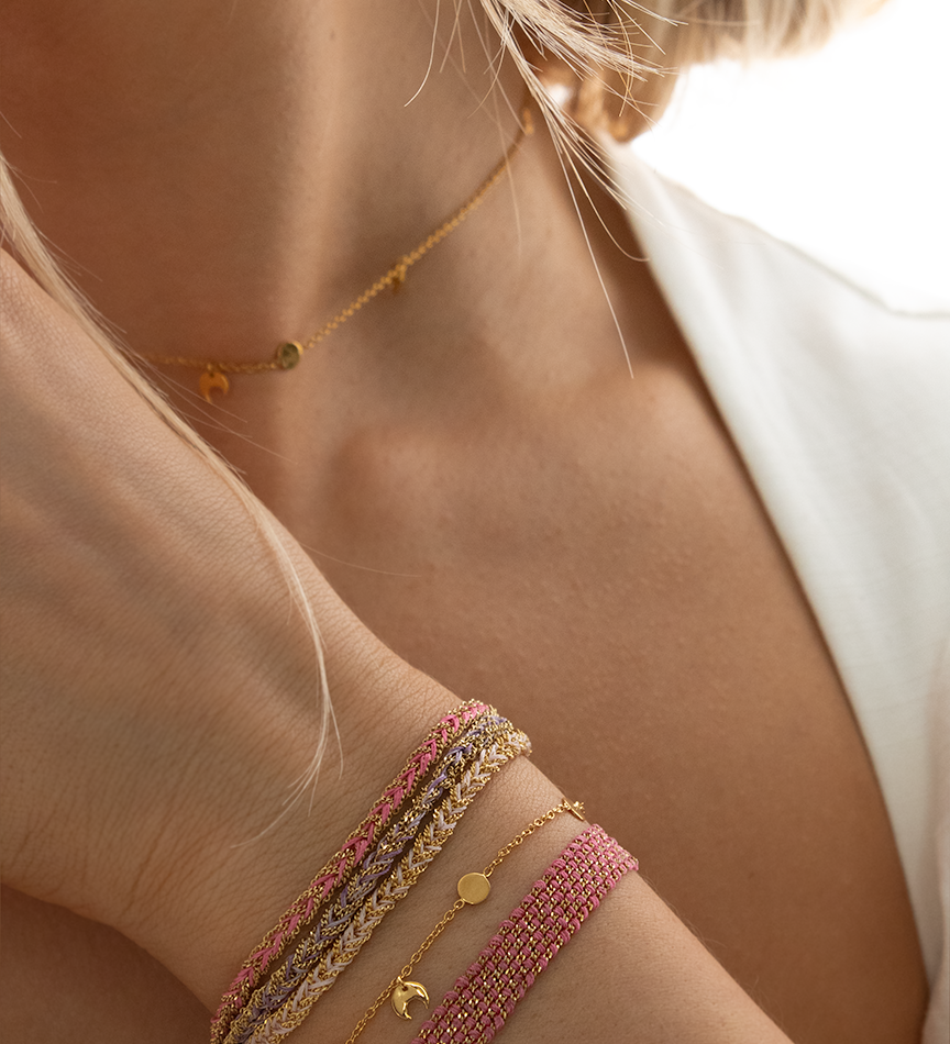 The perfect autumn accessories with gold necklaces, colourful friendship bracelets, and beautiful earrings!