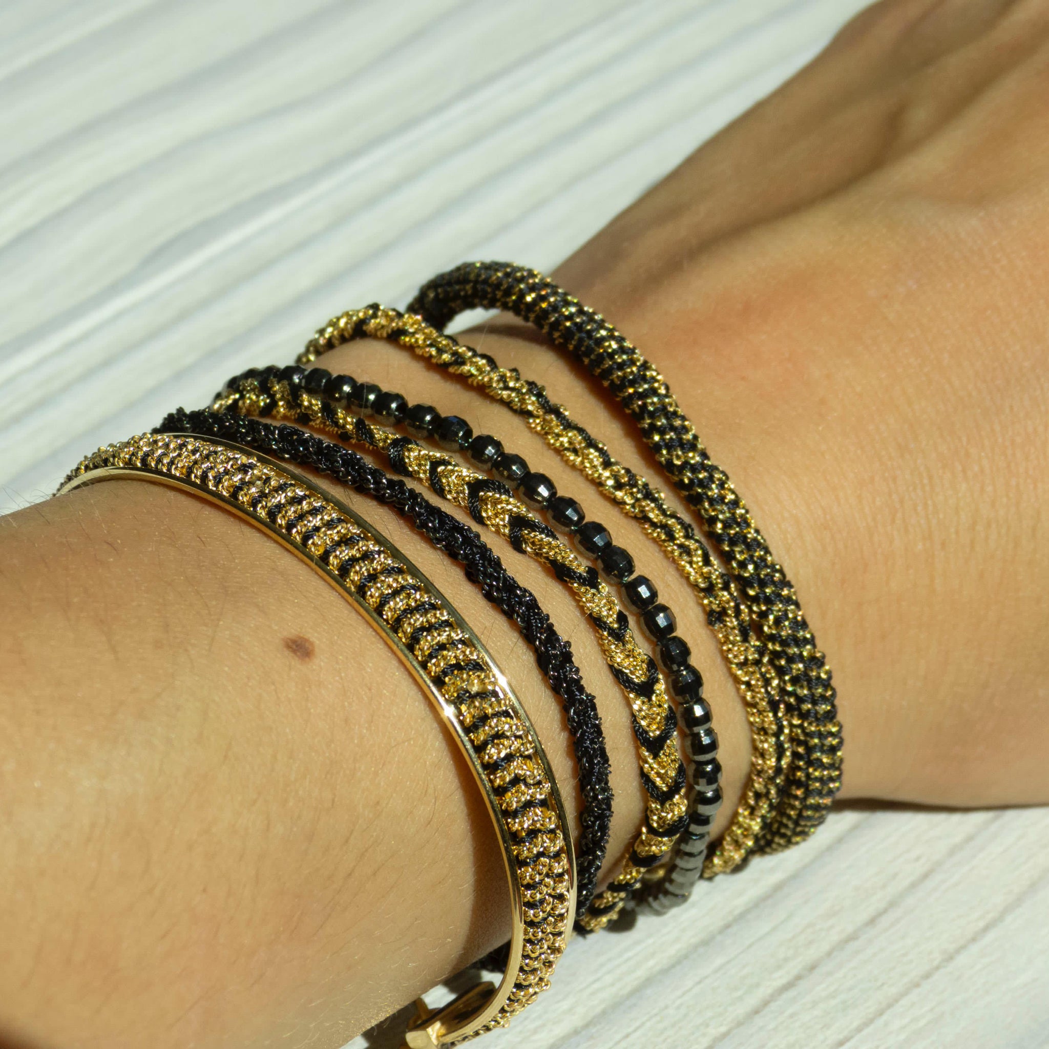 Add colour to your bracelet stack, with this signature woven cuff. Intricately woven with black silk and 18ct gold vermeil chain. Features an added chain for adjustable length to fit any arm. Wear it solo or with a Panama Friendship Bracelet for more colour impact!