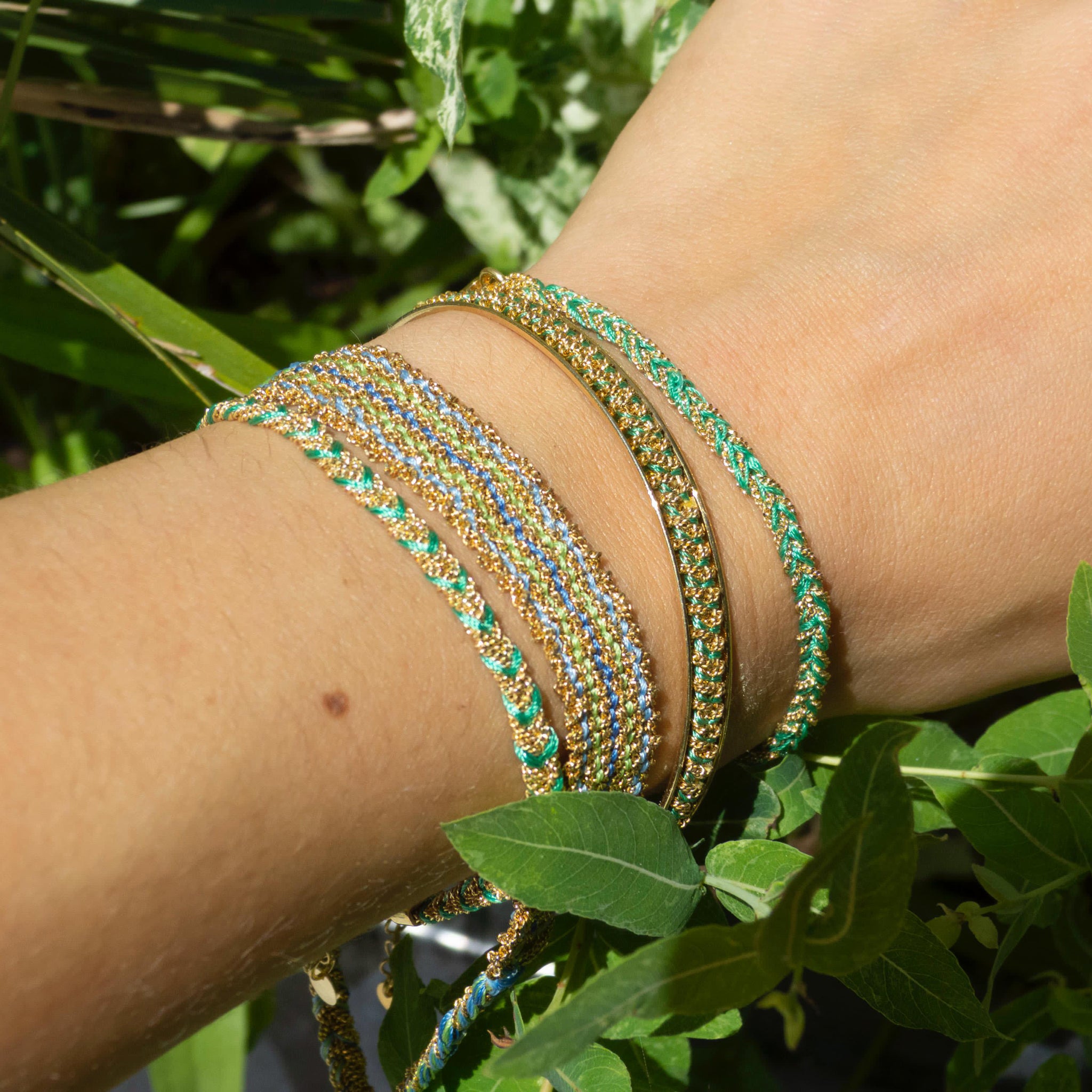 Add colour to your bracelet stack, with this signature woven cuff. Intricately woven with Green silk and 18ct gold vermeil chain. Features an added chain for adjustable length to fit any arm. Wear it solo or with a Panama Friendship Bracelet to add more colour!