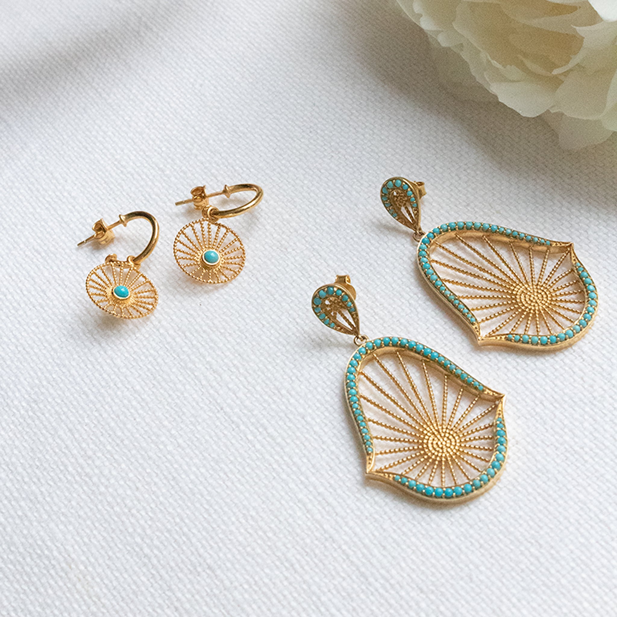 An ASSYA must have, these gorgeous statement earrings in 18ct Gold Vermeil feature beautiful Turquoise Stones. Inspired by the beauty of the oriental lotus flower, they will add glamour and elegance to any outfit and make the perfect for every occasion accessory!