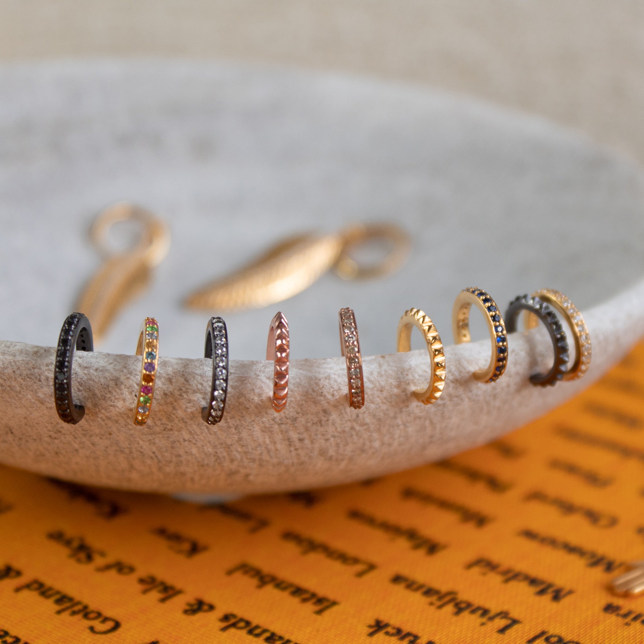 Build you ear stack wether you have ear piercings or not. Made from 18ct rose gold plated vermeil on sterling silver using 3 microns of gold to ensure long lasting wear. Features a sparkling grey diamond pave'. Simply slip it on your ear and slide it up and down to find the perfect fit. Stack it with one or more ear cuffs from the collection to build your look.