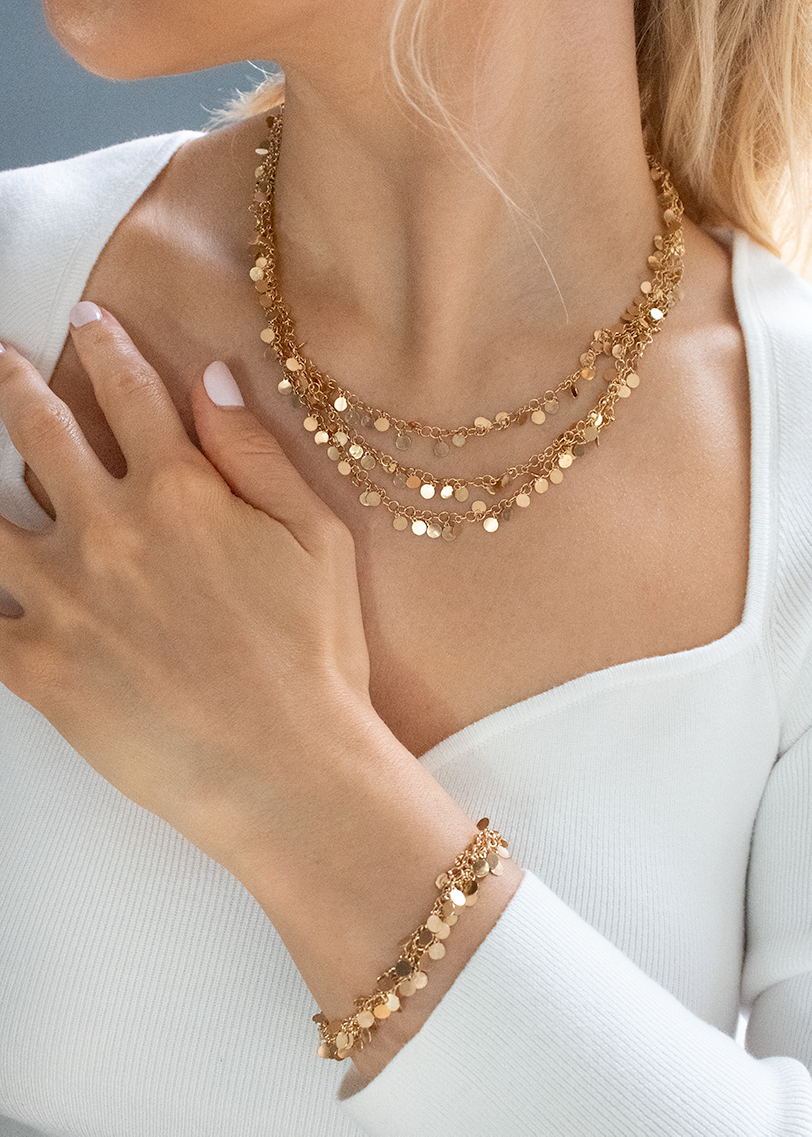 This fun and sparkling gold Bellini three layered necklace is made of 3 strands of 18ct gold vermeil chain with little dangling discs attached all joined together at the back. This gold plated necklace will add a touch of glamour to any outfit! Wear it with the Bellini bracelet for a complete look.