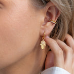 A single hoop earring with the Hamsa Charm. It is made with 18ct gold plated vermeil on sterling silver using 3 microns of gold to ensure long lasting wear. It features a protective hand charm made a white zircon gem. It has an easy to open fastening with which you can remove and replace the charm with another one from the collection. Wear it on its own or mix it with another charm hoop from the collection.