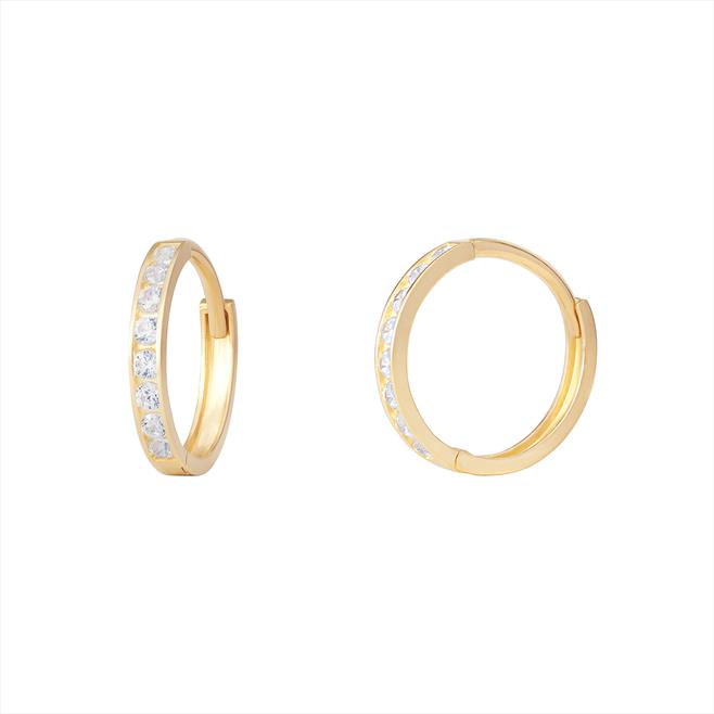 These 9ct solid gold hoop earrings set with cubic zirconia are a wardrobe staple. They feature a hinged opening for ease. Wear them on their own or stack them with our stud earrings.