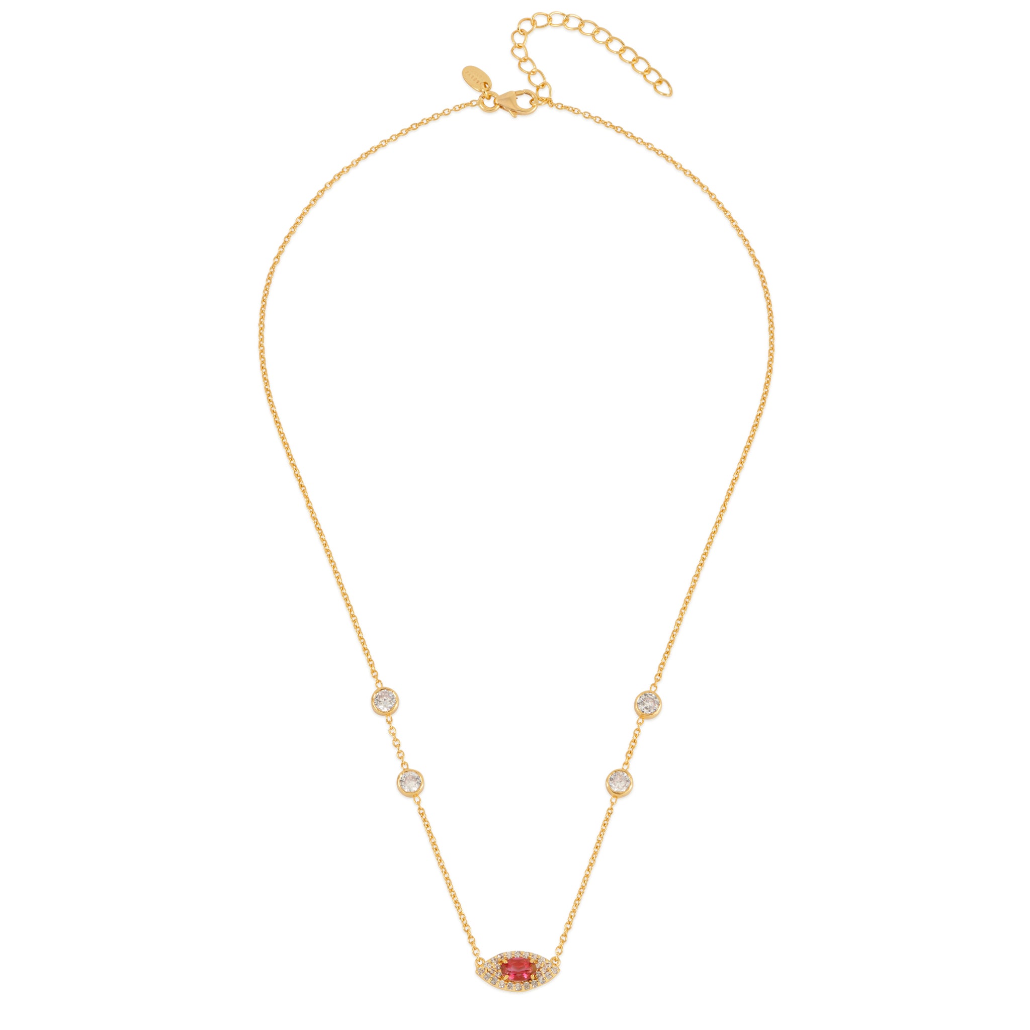 A must have in your jewellery box, this pretty necklace features a protective eye charm with a Pink Topaz centre and a sparkling cubic zirconia pave'. Wear it to ward off any malevolent spirit and to add colour and charm to your neck stack!! It features an 18ct gold plated chain and natural White Zircon studs. It has a 5cm chain extension for adjustable length to layer with other necklaces. Also available in Pink Topaz and Green Peridot.