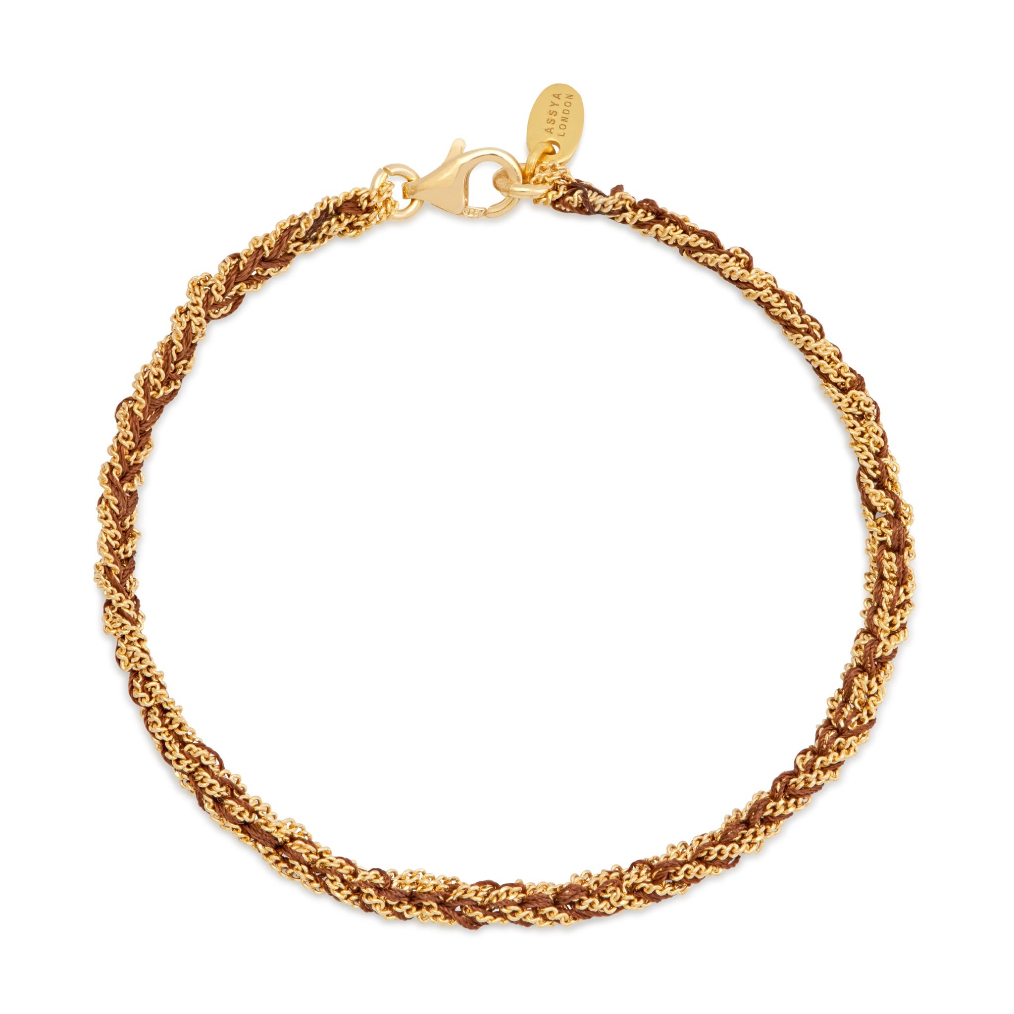 ASSYA's Panama friendship bracelet is colourful, fun and makes a great gift. Inspired by the woven fabrics in Central America, it is hand woven on an Italian loom using a unique Florentine technique. It is braided from Brown Natural Silk thread and Gold Vermeil chain. It has a lobster clasp closure. Wear it elegantly on its own or layer it together with other ASSYA bracelets.