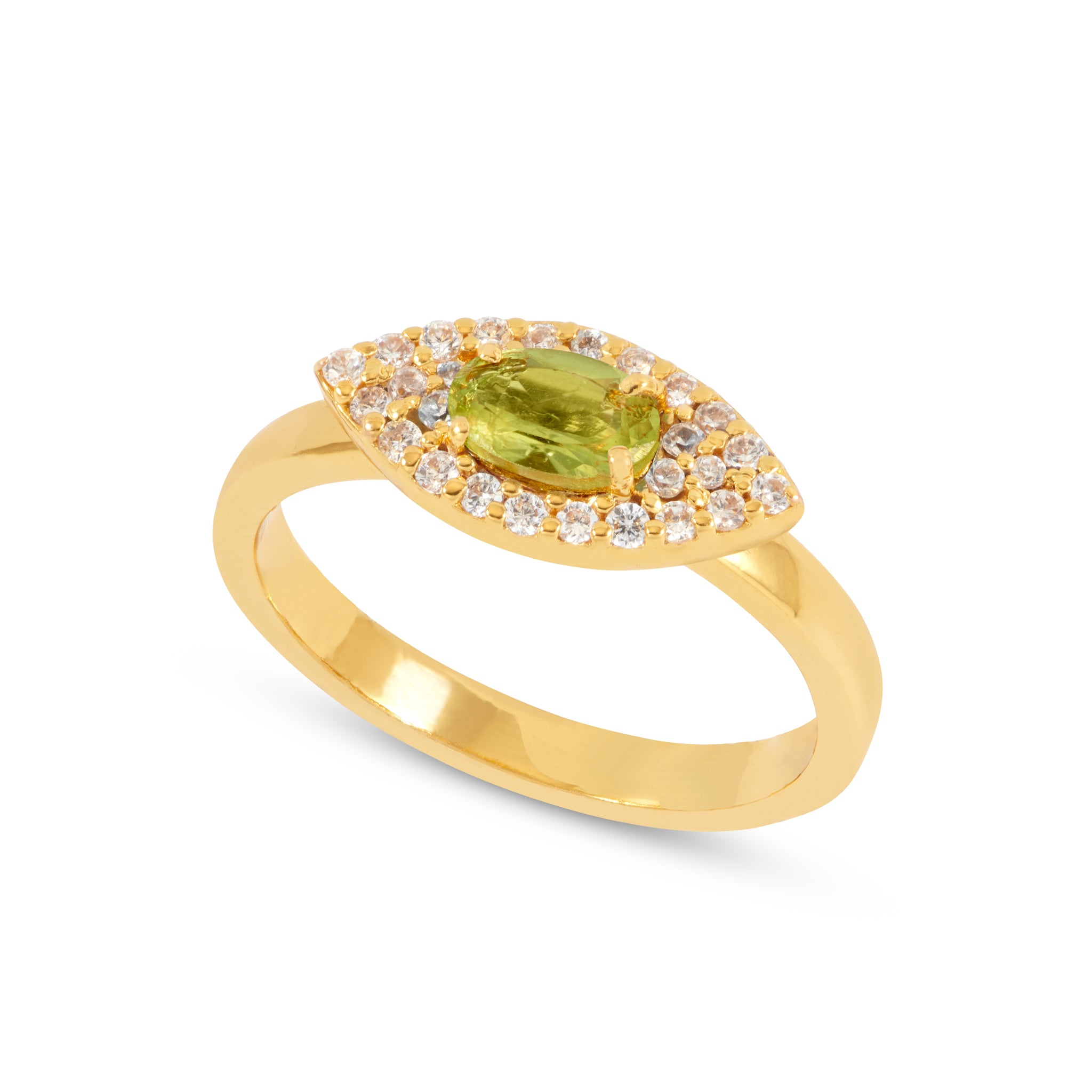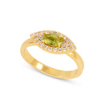 A must have in your jewellery box, this pretty ring features a protective eye charm with a Green Peridot centre and a cubic zirconia pave'. Designed as a modern talisman, it symbolises love and protection while adding colour and charm to your ring stack. Made with Green Peridot, 18ct gold vermeil and natural White Zircon.  Also available in Blue and Pink Topaz and Green Peridot.