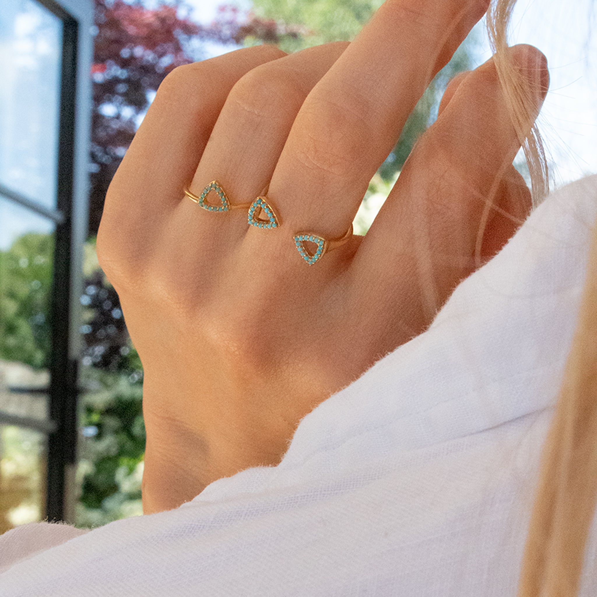 A gold vermeil ring with a turquoise element in the shape of a triangle, set with smaller turquoise stones around the circumference.