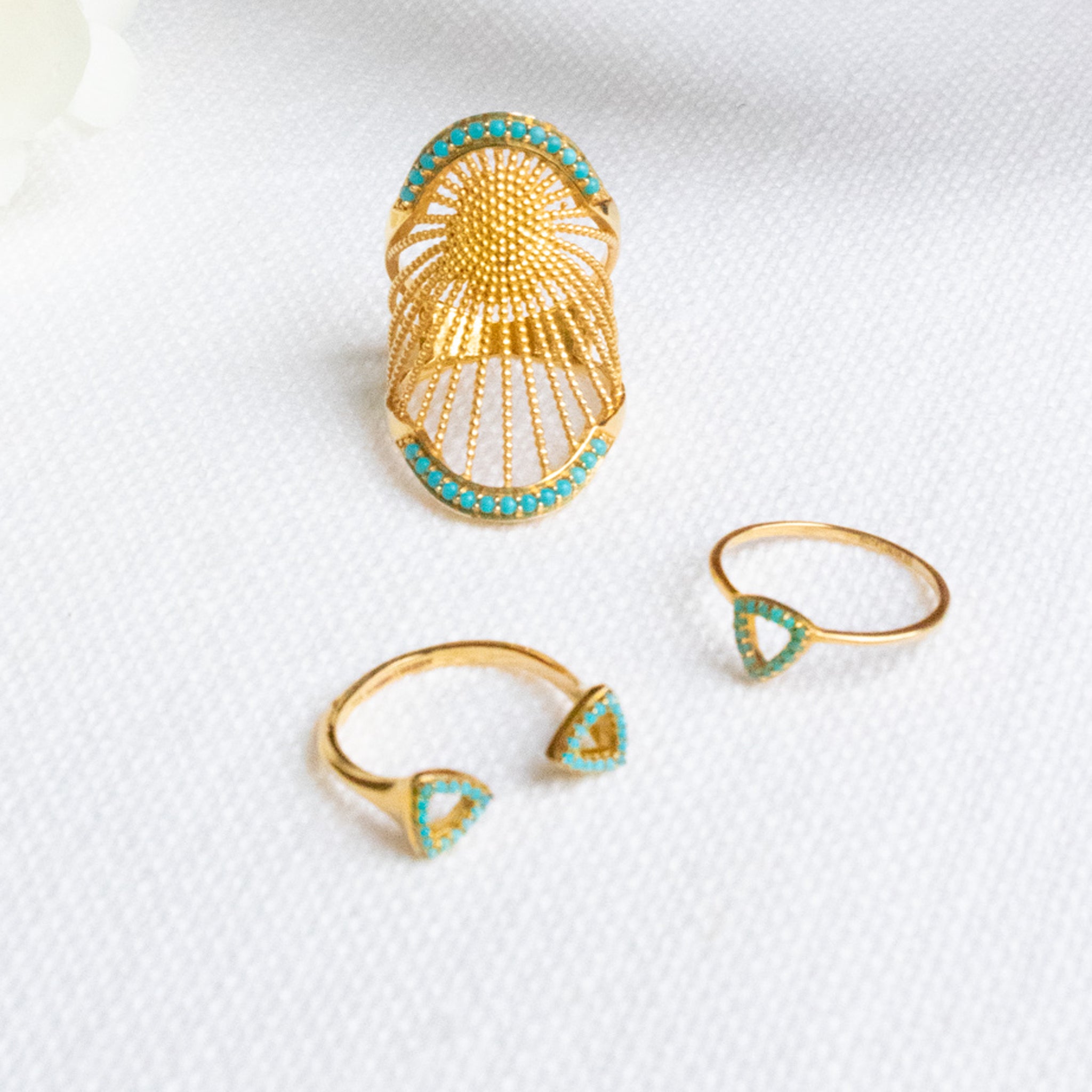 This pretty and chic ring is handcrafted in 18ct Gold Vermeil and set with Turquoise stones. Wear it on its own or stack with other rings from the collection.