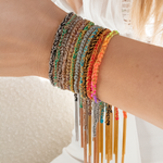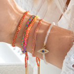 A colourful and fun version of a friendship bracelet. Inspired by the woven fabrics in Central America, it is hand woven on an Italian loom using a unique centuries old technique. It is braided from bright multi-coloured silks and Gold Vermeil chain. Our chain are plated with 3 microns of gold to ensure long lasting wear. The bracelet features a lobster clasp closure for easy fastening! Wear it on its own or stack it together with other colours from the collection.