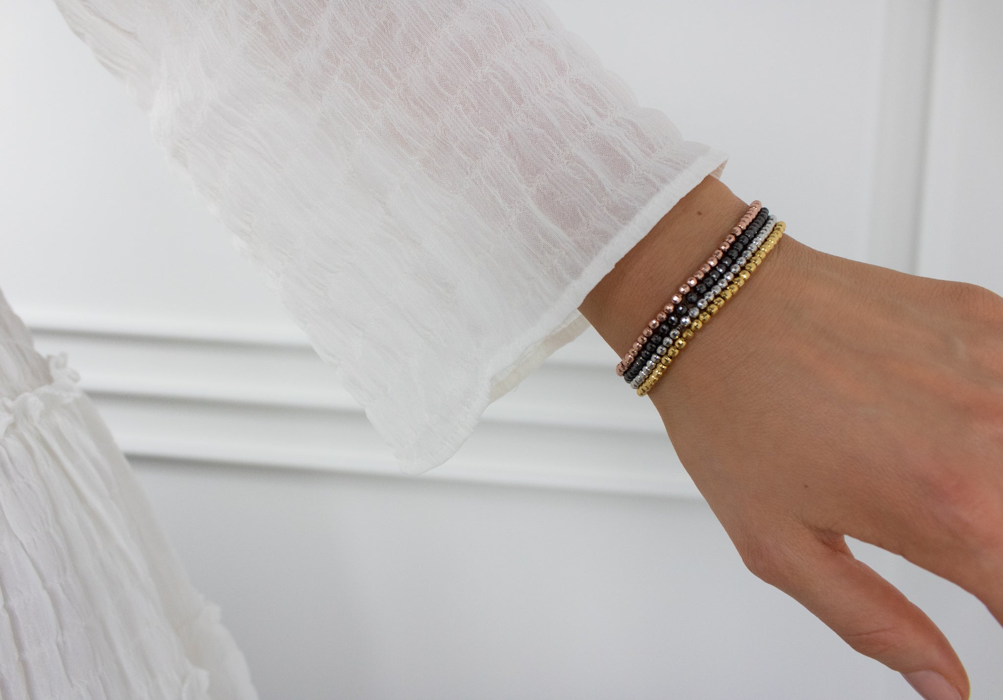 Add some sparkle to your wrist with the Panama Disco bracelet. It is made with 18kt Gold plated Sterling Silver chain and faceted beads. Wear it elegantly on its own or layer it with the other Panama Disco bracelets for the ultimate colourful stack.