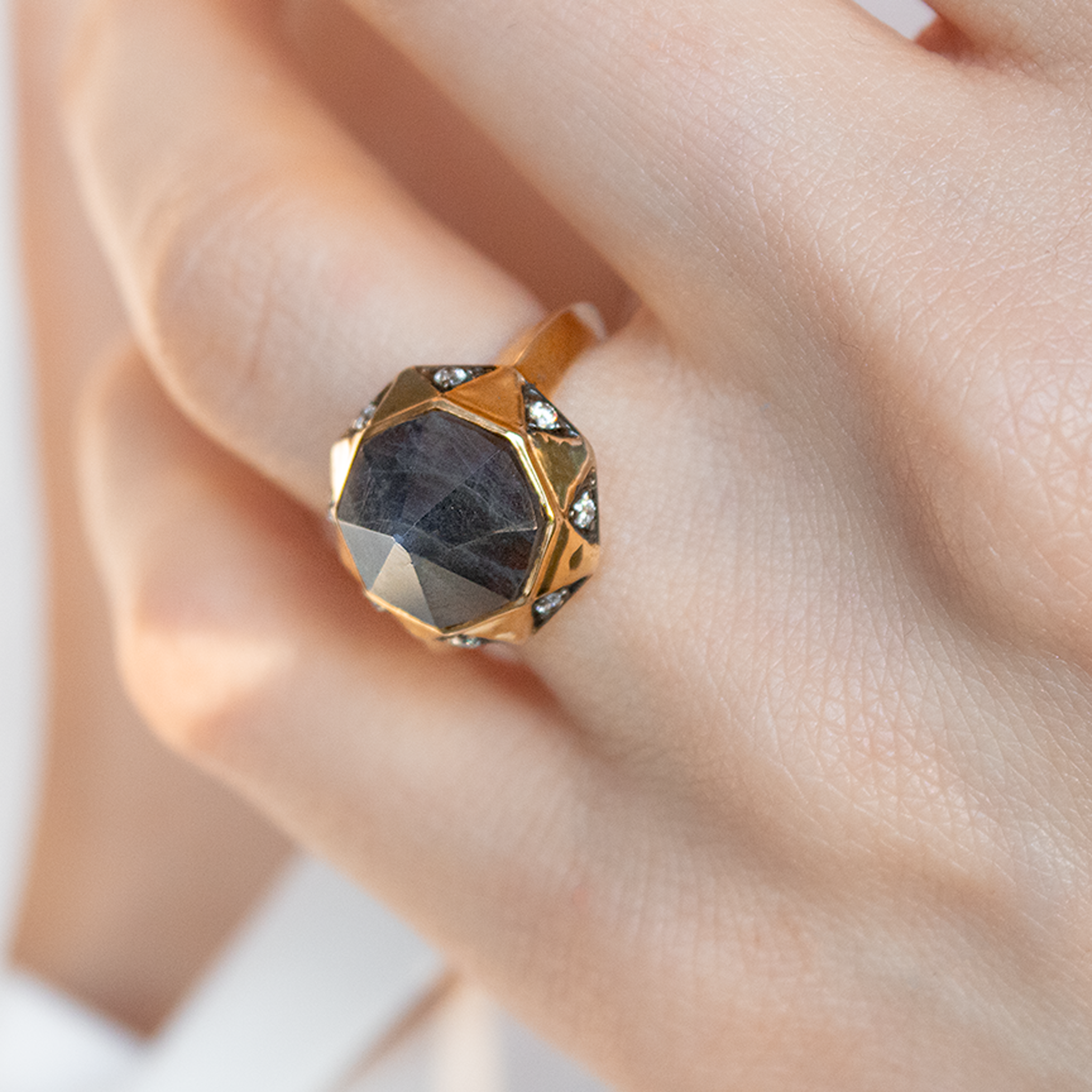 A 18ct gold plated vermeil open band ring with a hexagon-shaped labradorite gemstone in the center, surrounded by white diamond accents set in a gold-plated sterling silver setting.
