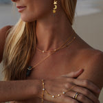 Inspired by the beauty and mystery of the cosmos and its connection to the earth, the Selene Necklace is made in 18ct gold vermeil and features natural White Zircon studs with Moon and Star motifs. It is the perfect piece to layer with longer necklaces. It has 2 jump rings for adjustable length.