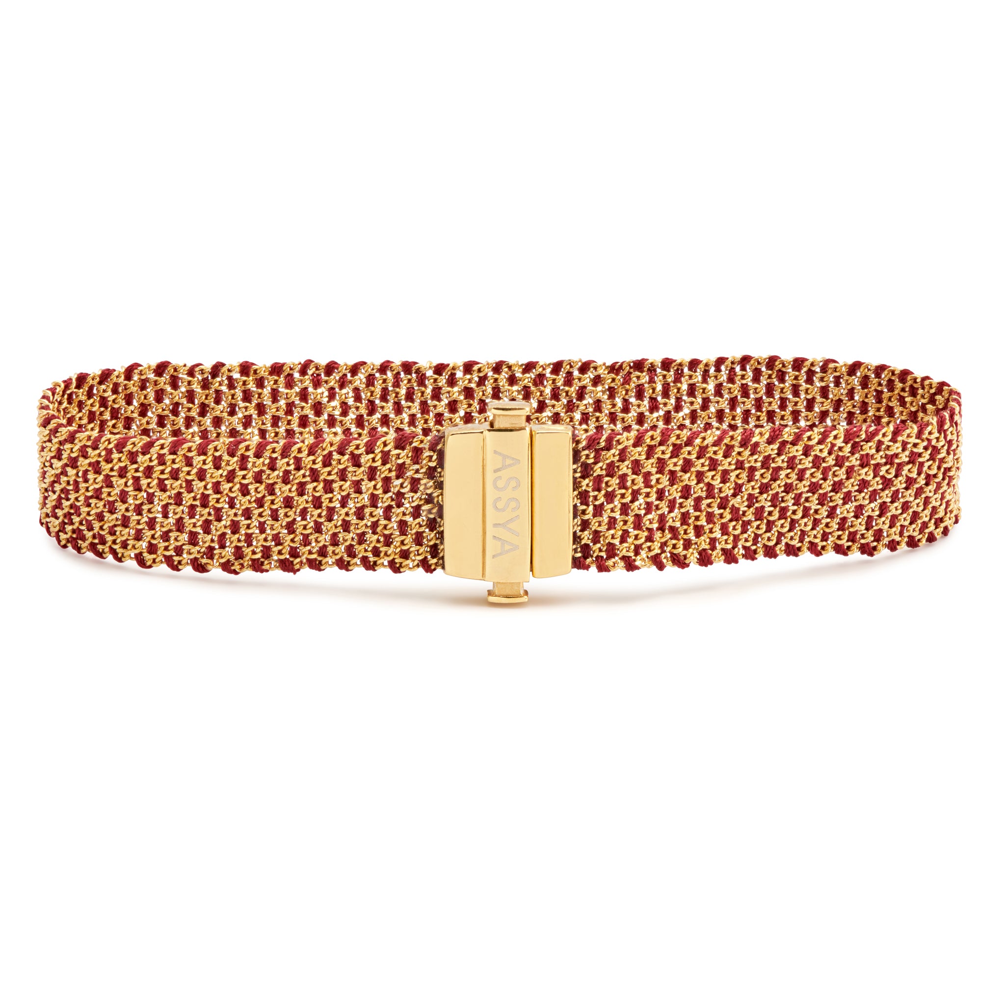 Exquisitely made, this intricate bracelet is weaved with 18ct Gold Vermeil and burgundy Silk into a unique design inspired by the ancient Aztec and Incas textiles. Wear it individually for subtle luxury or layer it with a mix of styles for an eclectic combination. This accessory is a treasure-forever piece.