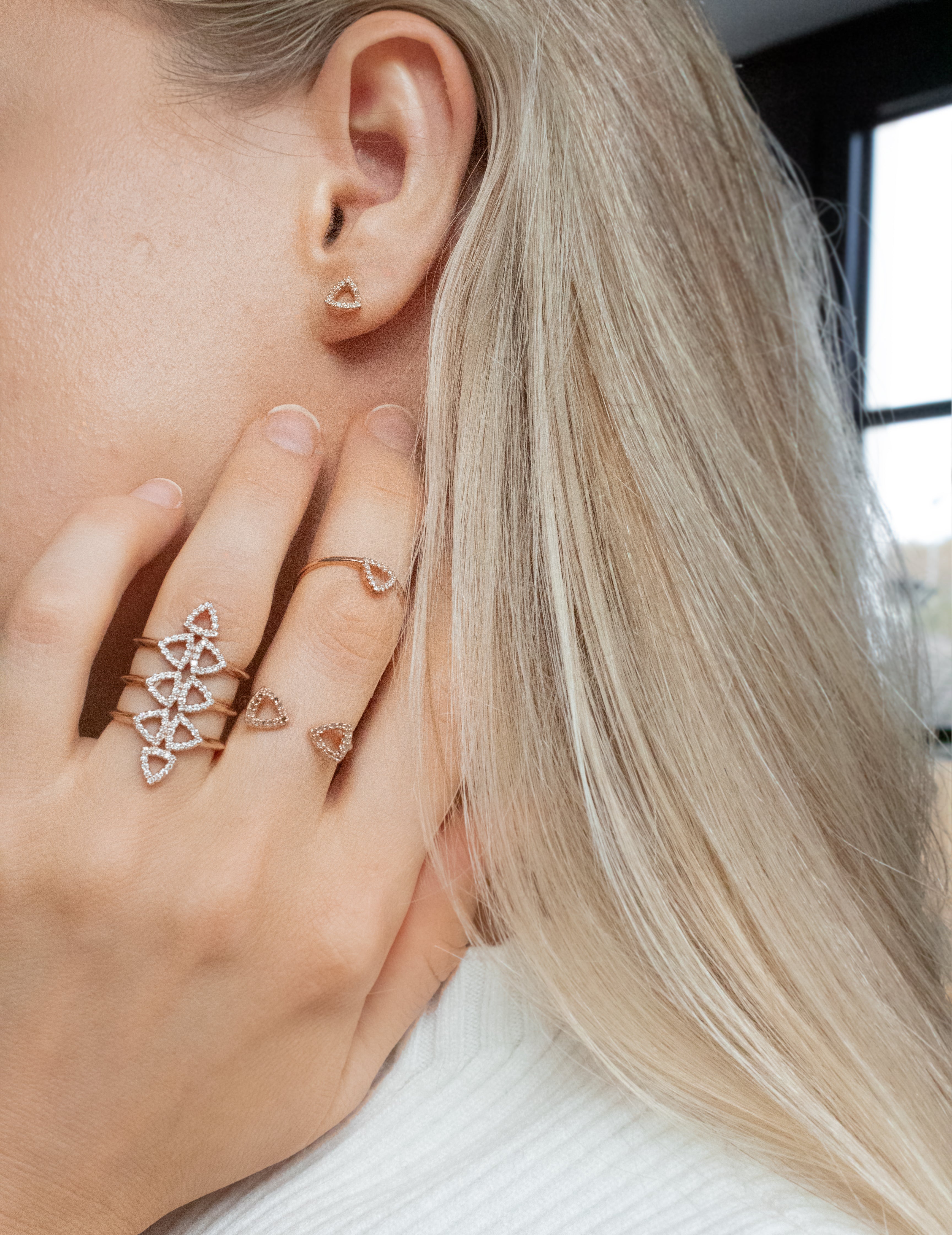 These pretty hand crafted stud earrings are perfect to wear everyday either as a standalone pair or mixed and matched with other earrings. Made from 18ct Gold Vermeil with sparkling Zircons, they are inspired by the symbolism of the triangle; ideal for a second or third hole.